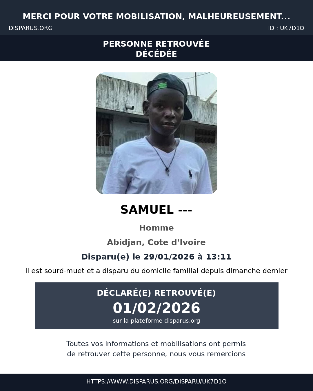 Il est sourd-muet et a disparu du domicile familial depuis dimanche dernier