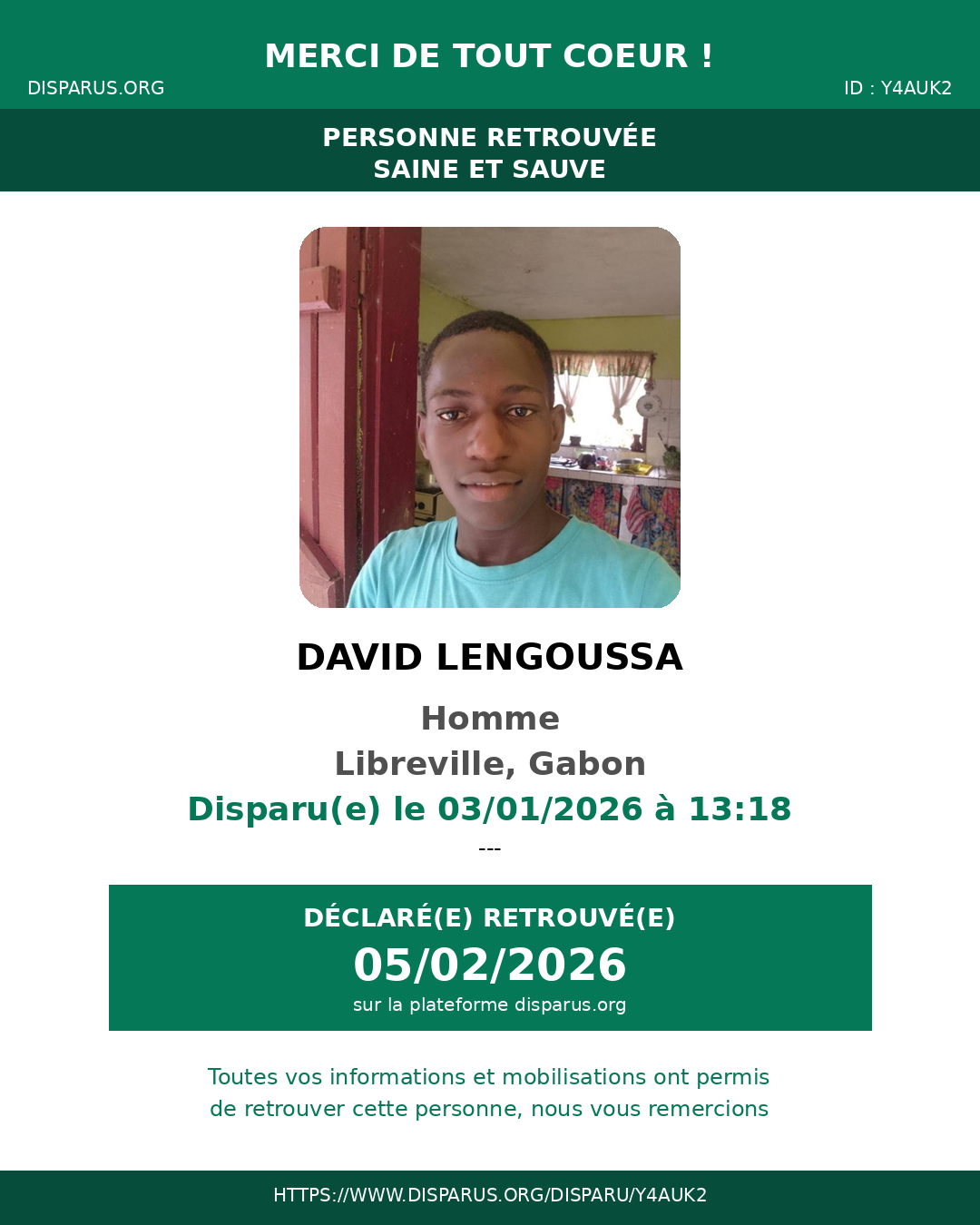 Nous vous remercions sincèrement, chers membres, pour vos prières et votre chaîne de solidarité. Nous avons retrouvé le jeune David LENGOUSSA à derrière la prison. Votre soutien nous a été d'une aide précieuse.